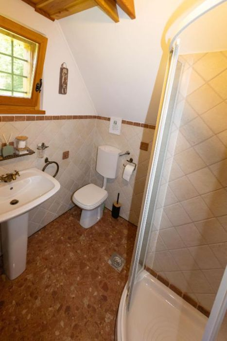 V zgornjem nadstropju koče je gostom na voljo velik balkon s predelom za sedenje, kjer lahko uživate v kavici in prekrasnem pogledu na okoliško naravo.