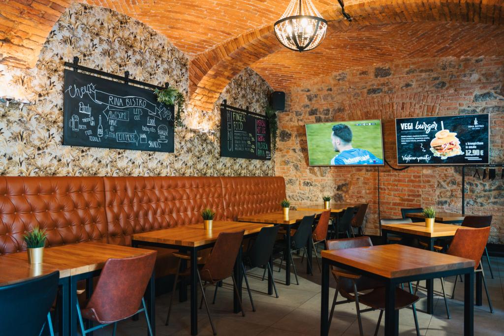 Rina Bistro je znan po svojem prijetnem, stilsko urejenem prostoru z opečnatimi oboki, toplimi materiali, udobnim oblazinjenjem in sodobno osvetlitvijo. Prostor je zasnovan tako, da omogoča uravnoteženost med sproščenim druženjem in intimnejšimi trenutki. Zaradi svojih naravnih odtenkov, rustikalnih detajlov in topline ambienta je dober prostor za zaključene družbe v Ljubljani, kjer se vsak dogodek počuti avtentično in prijetno.