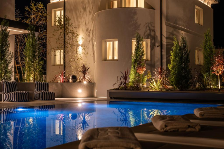 Ko gost prestopi prag tega butičnega kompleksa, začuti, da vstopa v okolje, kjer je vsak detajl zasnovan premišljeno. Prostori dihajo, zrak se zdi mehkejši, pogled pa se spontano ustavi na tišini vode. Prav vila z bazenom ustvarja sidrišče, v katerem bivanje dobi svojo globino. Bazen ni le dodatek, temveč element, ki umirja ritem dneva in vnaša občutek kontinuitete med notranjim in zunanjim svetom.