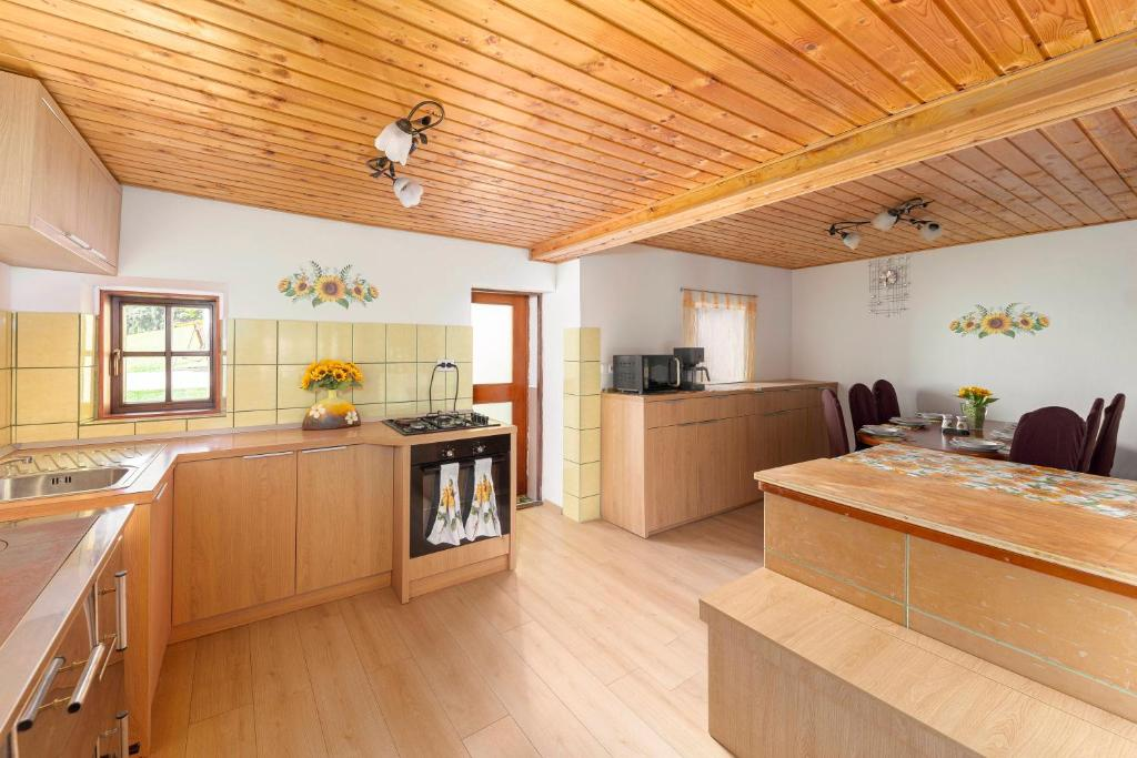 Sunflower House zajema tri udobne spalnice, svetlo kopalnico, polno opremljeno kuhinjo in večnamenski prostor z veliko pečjo ter manjšo pisarno. Vzdušje v hiši je sproščeno, leseno pohištvo in krušne peči, ki skrbijo za ogrevanje vseh prostorov in so odlične za peko pic, pa dajo nastanitvi še tisto piko na i, da se zares počutite kot na domačiji.