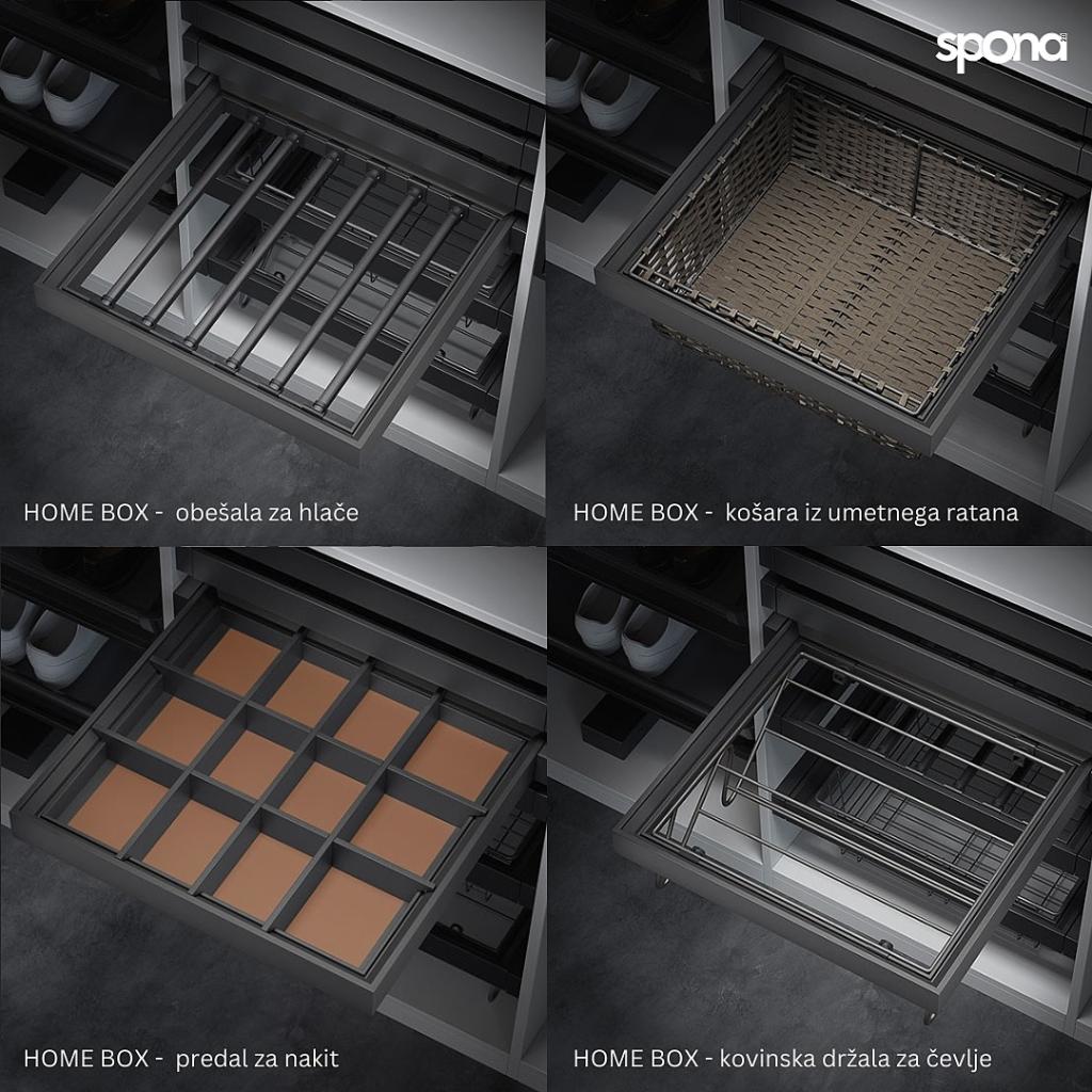 - dodatke, kot so ročaji, obešalniki in drugi funkcionalni elementi, ki prostoru dodajo končni estetski poudarek in izboljšajo uporabniško izkušnjo.