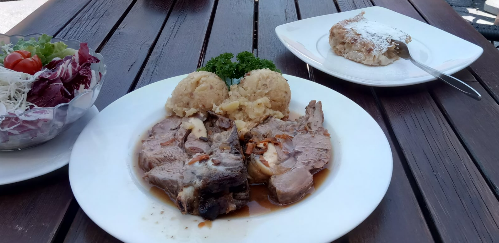 Malica odlična kot kosilo goveja juha,glavna jed,veliko solate in nato še sladica.SUPER.