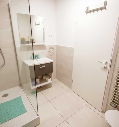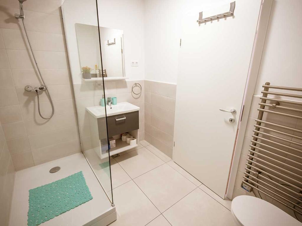 Kopalnica je opremljena z veliko in udobno tuš kabino. Gostom so na voljo brezplačno tekoče milo, brisače in sušilnik za lase. Za dodatno udobje in čistočo je v apartmaju tudi robotski sesalnik, ki ga lahko gostje po želji uporabljajo med bivanjem.