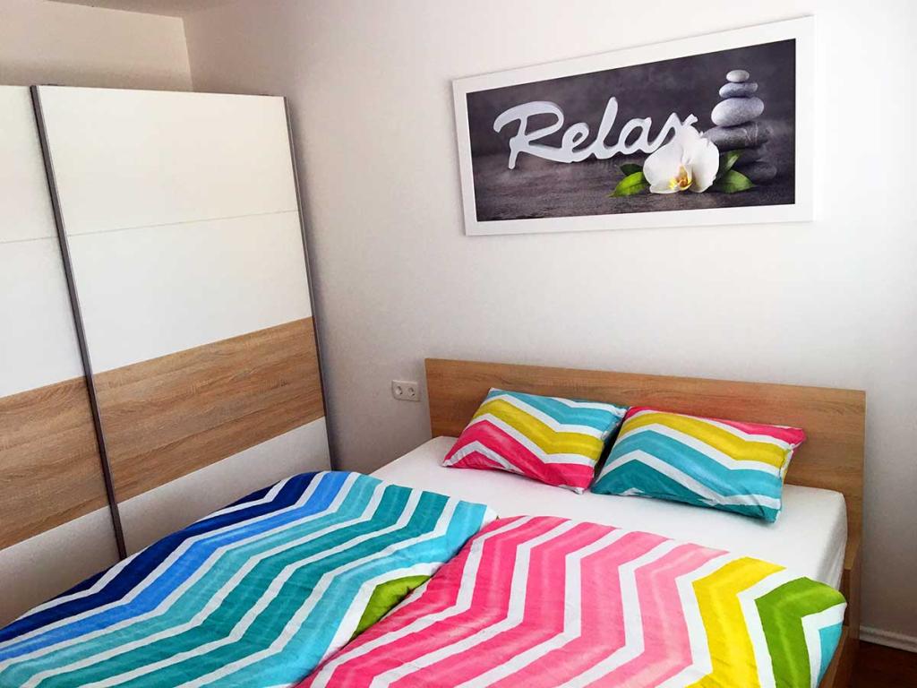 Spalnica je opremljena z zakonsko posteljo in vključeno posteljnino. Za družine z majhnimi otroki je na voljo tudi ločena otroška postelja za otroke do 2 let. Skupaj apartma nudi 4 ležišča za odrasle osebe, in sicer zakonsko posteljo ter raztegljiv kavč z udobnim ležiščem, kar omogoča prilagodljivost pri nastanitvi.